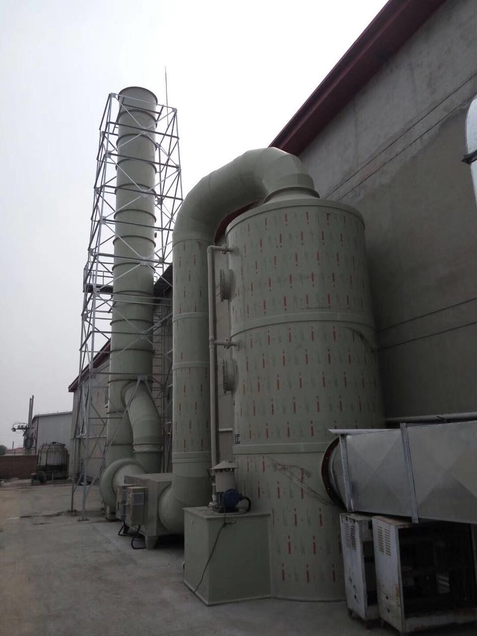 工作原理:酸雾废气由风管引入净化塔,经过填料层,废气与氢氧化钠吸收液进液两相充分接触吸收中和反应,酸雾废气经过净化后,再经除雾板脱水除雾后由风机排入大气。吸收液在塔底经水泵增压后在塔顶喷淋而下,后回流至塔底循环使用。净化后的酸雾废气达到排放要求。
