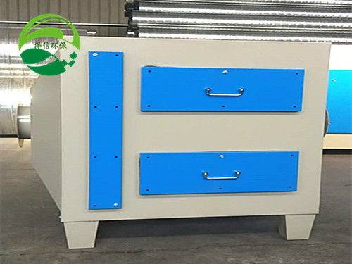 当废气通过引风机引入吸附箱后进入活性炭吸附层,由于活性炭吸附剂表面上存在着未平衡和未饱和的分子引力或化学键力,因此当活性炭吸附剂的表面与气体接触时,就能吸引气体分子,使其浓聚并保持在活性炭表面,此现象称为吸附。利用活性炭吸附剂表面的吸附能力,使废气与大表面的多孔性活性炭吸附剂相接触,废气中的污染物被吸附在活性炭表面上,使其与气体混合物分离,净化后的气体高空排放。活性炭环保箱是一种干式废气处理设备,由箱体和填装在箱体内的吸附单元组成。