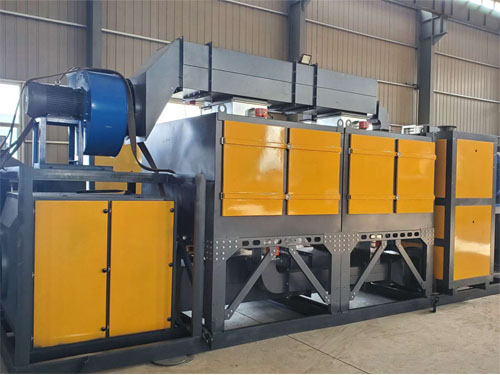 催化燃烧设备在工作时先将废气用活性炭吸附,当活性炭达到吸附饱和时停止吸附操作,然后在适当温度范围内使活性炭发生脱附;脱附下来的物浓度较原来提高几十倍并送入催化燃烧室进行催化燃烧反应,在催化剂表面于200~350℃条件下进行催化氧化反应,使其转化为的水和二氧化碳。所以这种设备经常用于喷漆房废气处理、喷涂车间废气处理。